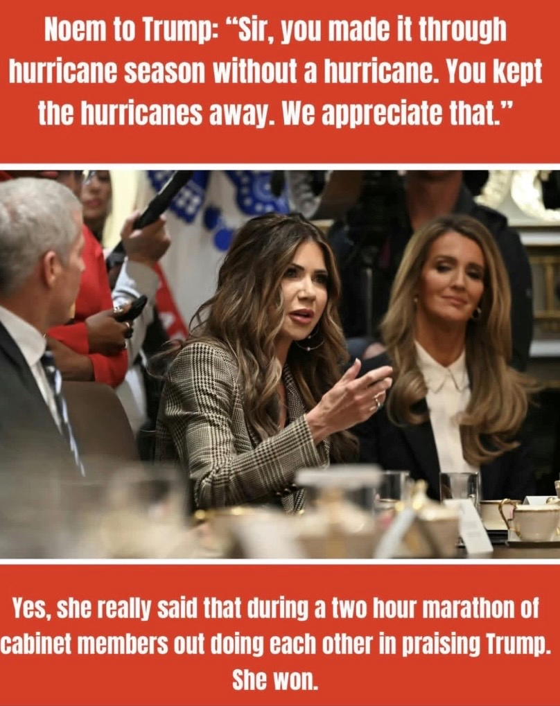Which brings us to Kristi Noem. She almost got the boot with the drownings in Texas. But her Cruella Deville performances with ICE kept her in Trump’s good graces. Now, however, she has also become a liability. Not for cruelty or dishonesty; no, Trump and the regime thrive on cruelty and dishonesty. No Noem won’t last because no one takes her seriously anymore. Sucking up is all well and good but ludicrous statements during nationally televised events? “You kept the hurricanes away. Thank you for that.” Plus Kristi is knee-deep in some corruption on multiple fronts which distracts from the great distractor himself. So she’s probably next after Hegseth.