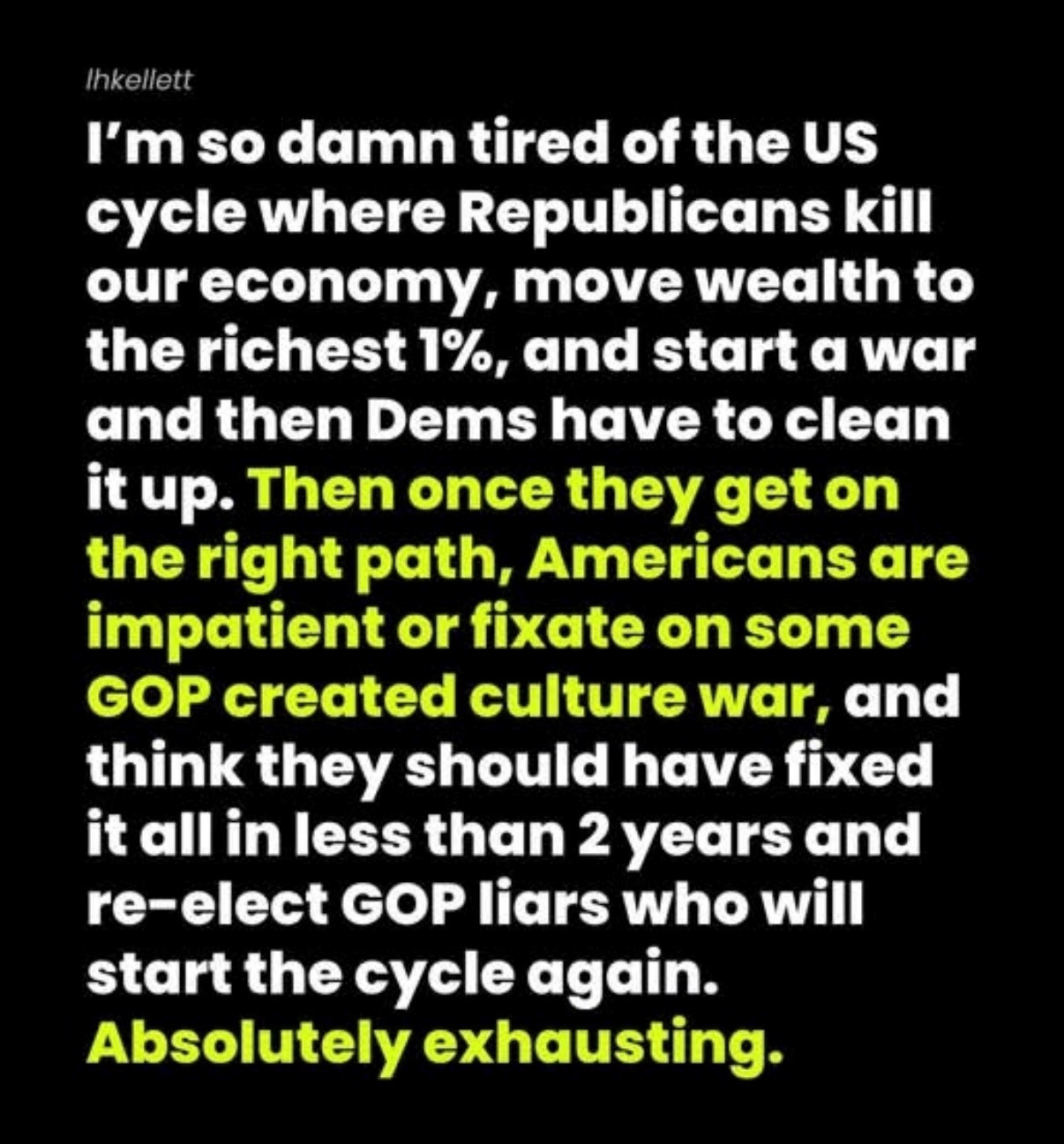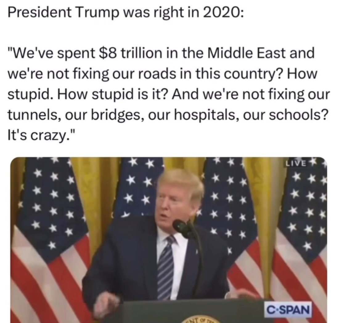 But we have the same tired formula as the past Republican presidential terms. Enormous tax cuts for the wealthiest people and businesses, cut benefits to the poor, bomb a Middle Eastern country, drive up gas prices, all while having campaigned as the anti-war candidate.