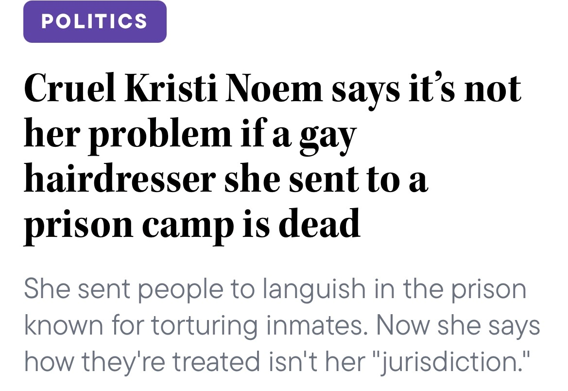 Which brings us to Kristi Noem. She almost got the boot with the drownings in Texas. But her Cruella Deville performances with ICE kept her in Trump’s good graces. Now, however, she has also become a liability. Not for cruelty or dishonesty; no, Trump and the regime thrive on cruelty and dishonesty. No Noem won’t last because no one takes her seriously anymore. Sucking up is all well and good but ludicrous statements during nationally televised events? “You kept the hurricanes away. Thank you for that.” Plus Kristi is knee-deep in some corruption on multiple fronts which distracts from the great distractor himself. So she’s probably next after Hegseth.