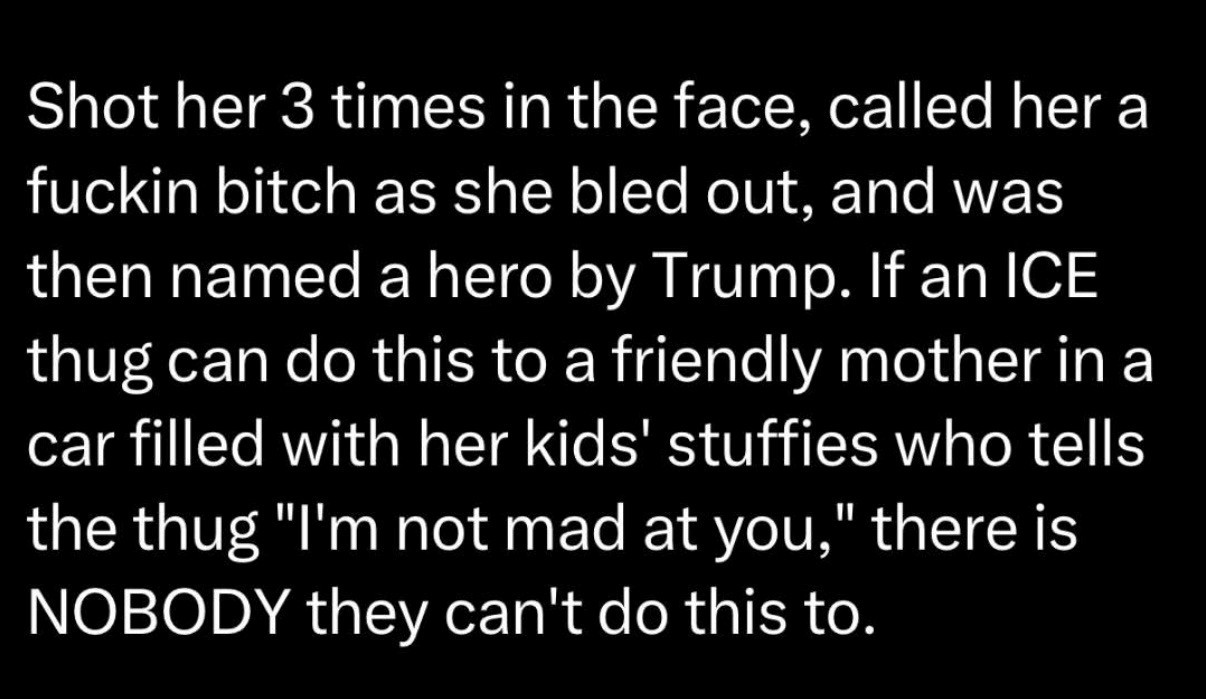 For God’s sake, where is Bob Dylan? He made his reputation and fortune from railing against this despotism and evil. Was it just performative for show, Bob? We’ve gone from blowin’ in the wind to a fellow Minnesotan mom gettin’ blown away in the snow. The Masters of War are on the march and you’re just sitting on that $350,000,000 you just got?*